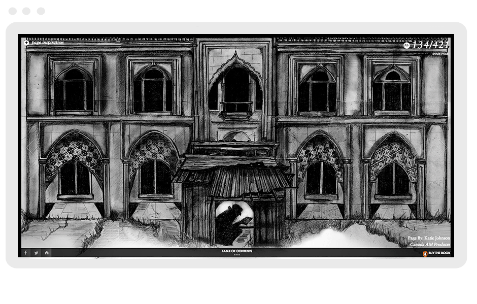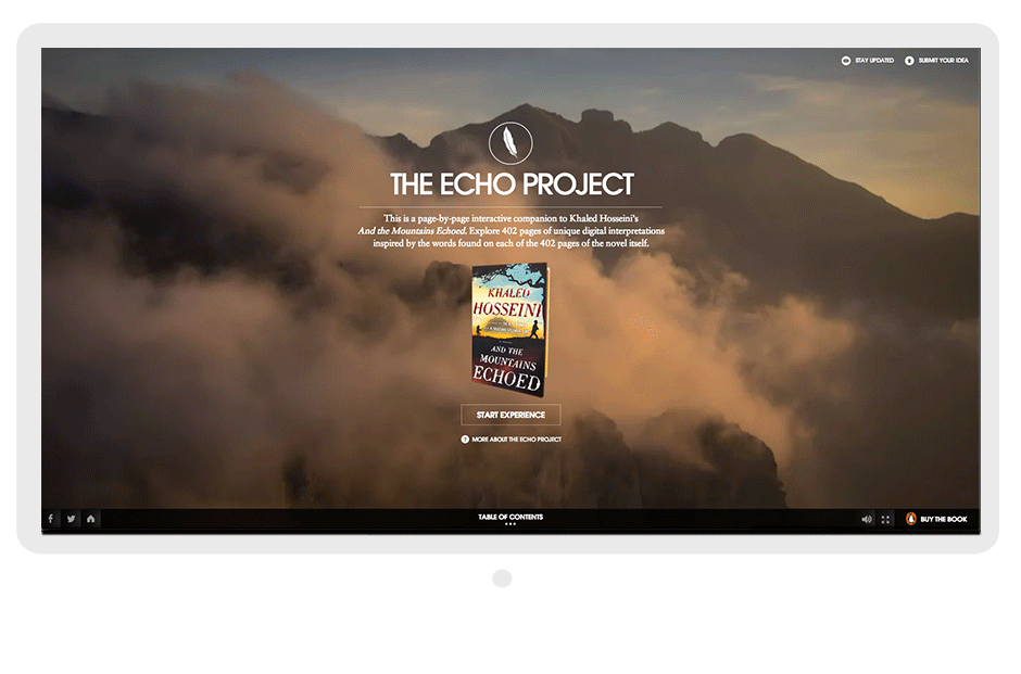 The Penguin Books Echo Project was created for the Canadian launch of Khaled Hosseini's latest novel, And The Mountains Echoed. An interactive companion for each of the 402 pages in the book was made in collaboration with Canadian authors, artists, illustrators, and bloggers.